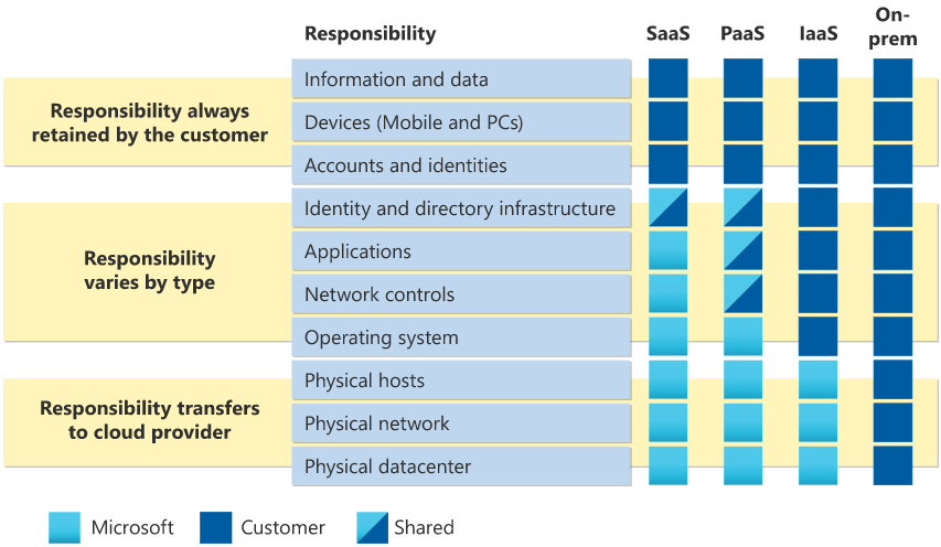 Dans le cadre d’Azure, Microsoft prend à sa charge la sécurité en relation avec les premières couches, votre rôle va alors dépendre du service utilisé (IaaS, PaaS, SaaS). Il est donc important d’adapter sa stratégie selon les services déployés :