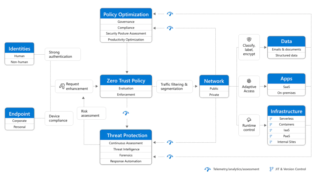 Comme pour la défense en profondeur, les identités, les périphériques, les applications, le réseau, l’infrastructure et les données sont tous des maillons critiques de la chaîne Zéro Trust. Le périmètre de contrôle est horizontal car il impacte tous ces domaines :