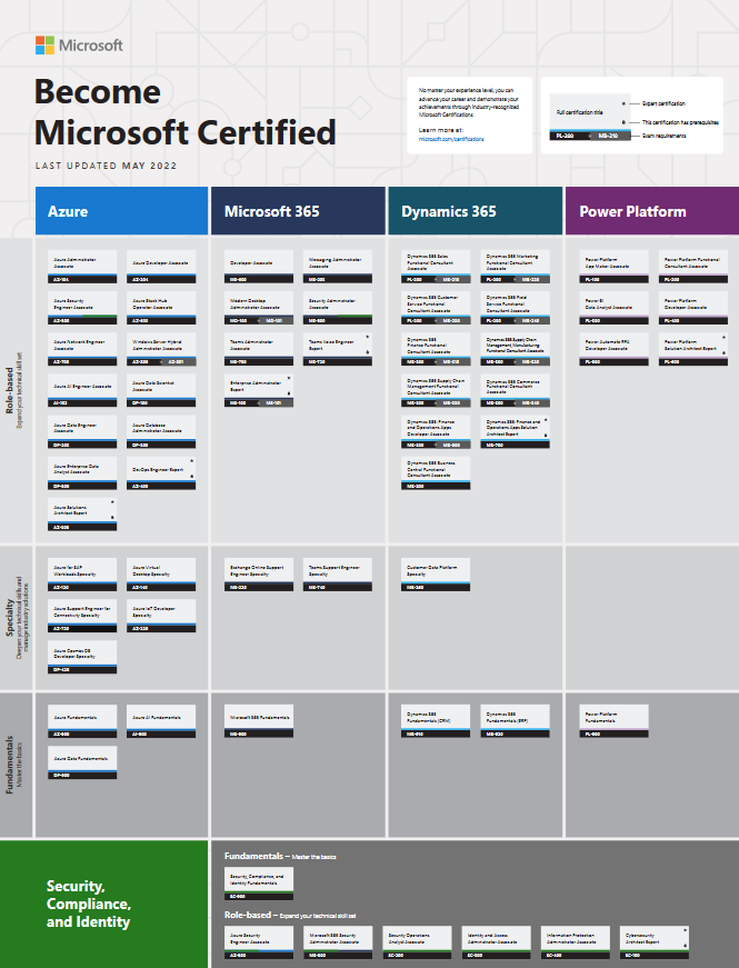 Voici un rappel du poster des certifications Cloud proposées par Microsoft. Ce document est utile car il contient toutes les certifications disponibles dans les 4 thèmes :