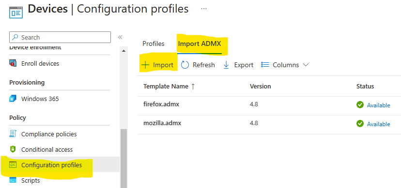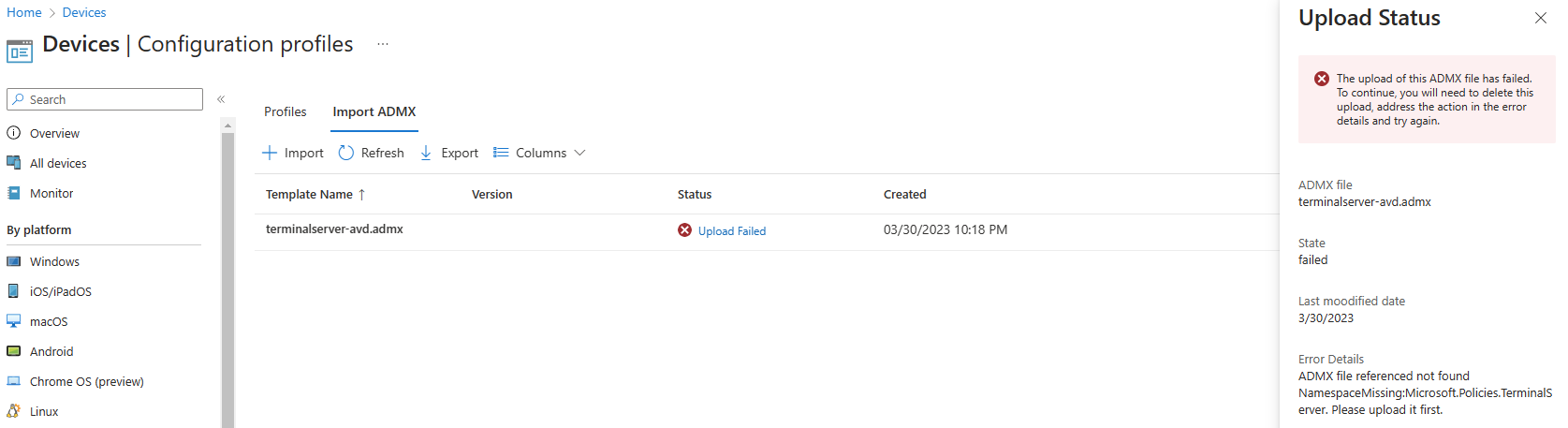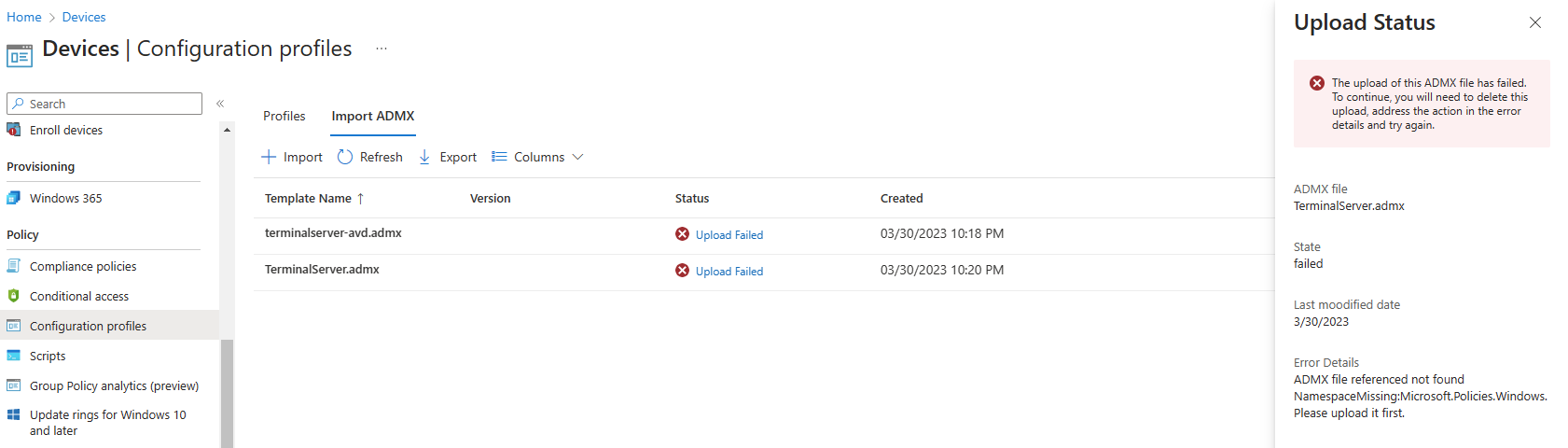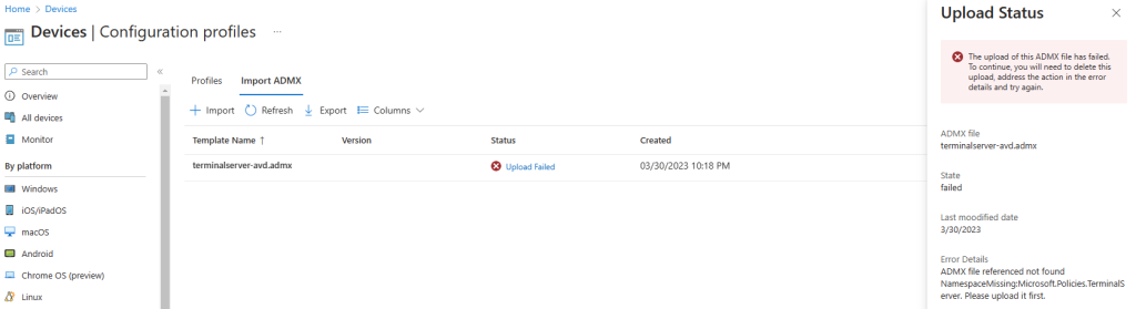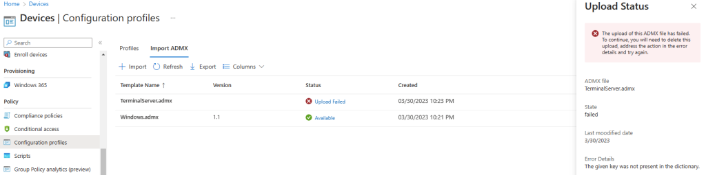 La dépendance Windows.admx est bien passée sur Intune, mais la réinstallation de TerminalServer.admx bloqua toujours :