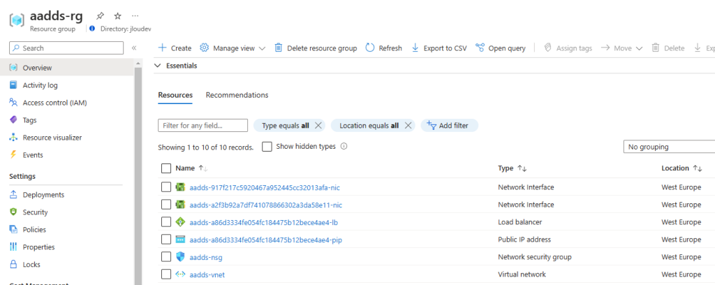 Voici d’abord les ressources liées au service Azure Active Directory Domain Services :