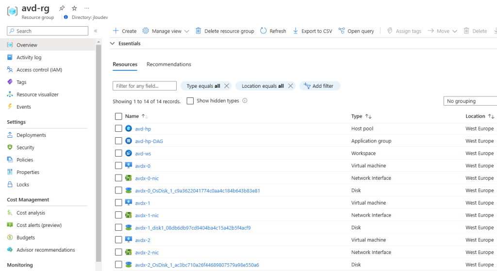 Afin de tester la fonctionnalité voulue, j’ai déjà déployé un certain nombre de ressources dans mon environnement Azure.