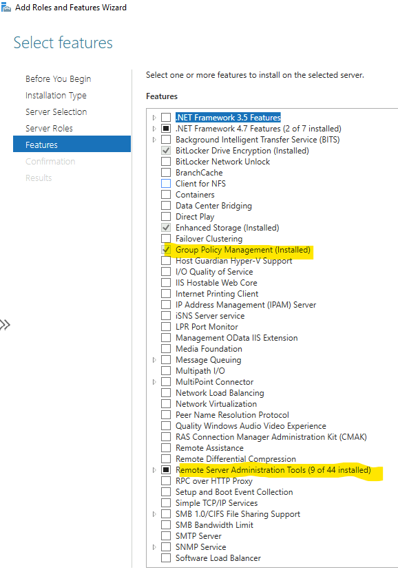 Pour cela, ajoutez les fonctionnalités liées aux GPOs, mais aussi les outils RSAT pour l’Active Directory :