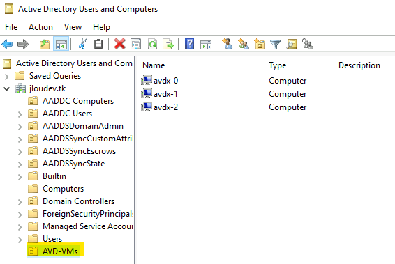 Créez si besoin une OU contenant vos machines virtuelles AVD :