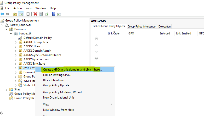 Sur votre OU contenant vos machines virtuelles AVD, créez une nouvelle GPO :