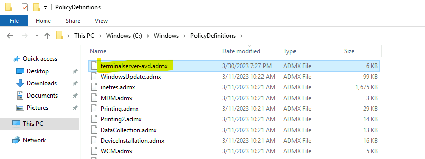- Copiez et collez le fichier terminalserver-avd.admx dans le dossier PolicyDefinitions à %windir%\PolicyDefinitions.