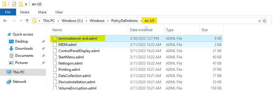 - Copiez ensuite le fichier terminalserver-avd.adml dans le sous-dossier en-us.