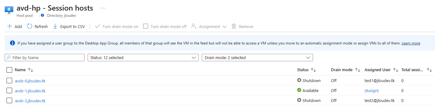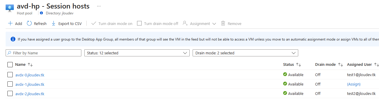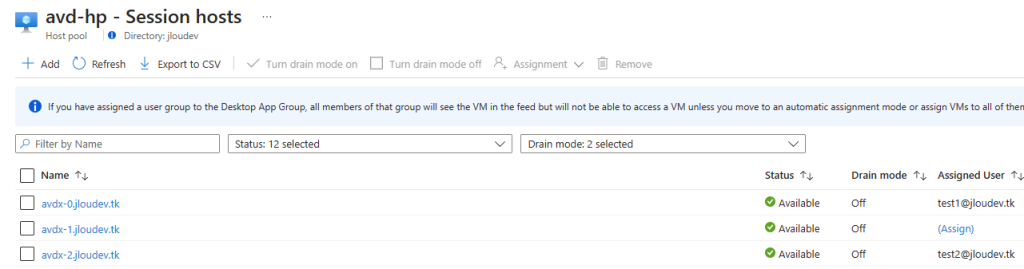 J’ai ensuite créé un service Azure Virtual Desktop, composé de 3 machines virtuelles individuelles. Ces 3 VMs sont liées à mon domaine Active Directory managé :