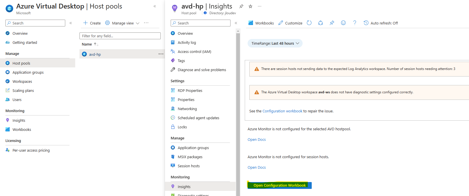 Retournez sur votre environnement Azure Virtual Desktop pour commencer la configuration vers le Log Analytics workspace, La configuration doit bien se faire sur les 3 éléments que compose tout environnement AVD :