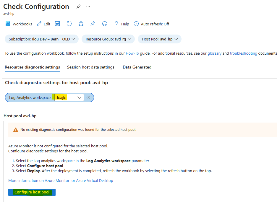 En commençant par le Pool d’hôtes, choisissez le Log Analytics workspace créé précédemment, puis cliquez sur Configurer :