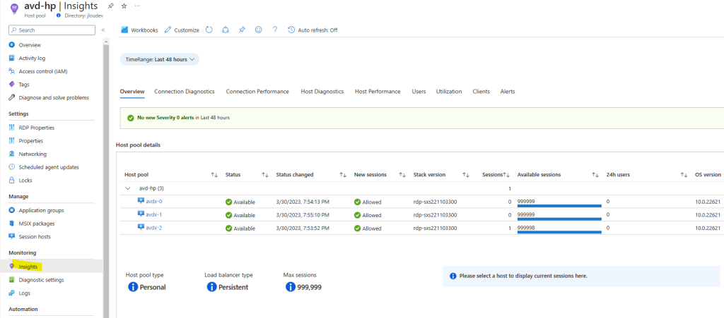 Quelques minutes plus tard, l’onglet Insights commence à s’alimenter en données de votre environnement AVD :