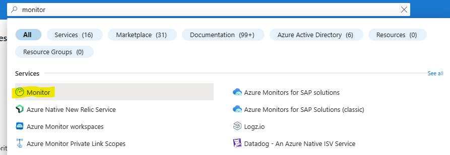 Sur votre portail Azure, recherchez le service Azure Monitor :